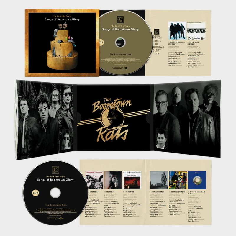 BOOMTOWN RATSFirst 50 Years: Songs of Boomtown GloryUniversal Music celebra i cinquant'anni trascorsi dalla nascita dei Boomtown Rats e il loro 50th anniversary tour con il primo greatest hits ufficiale della band di Bob Geldof dai tempi di "Back To Boomtown: Classic Rats Hits" del 2013. Compilata dagli stessi musicisti, la nuova antologia pesca da tutti e sette i dischi prodotti dal gruppo rock/new wave irlandese aggiungendo a hit come "Banana Republic", "Like Clockwork", "Rat Trap" e la celeberrima "I Don't Like Mondays" (entrambe numero 1 nelle classifiche del Regno Unito) ben sei brani da "Citizens Of Boomtown" del 2020. Ogni brano è annotato da ricordi e osservazioni del gruppo; non ci sono pezzi inediti e neanche tutti i singoli, mentre la versione su CD contiene 27 canzoni, tre in più di quella su LP, e include anche "Keep It Up", "House On Fire" e "Tonight" track list