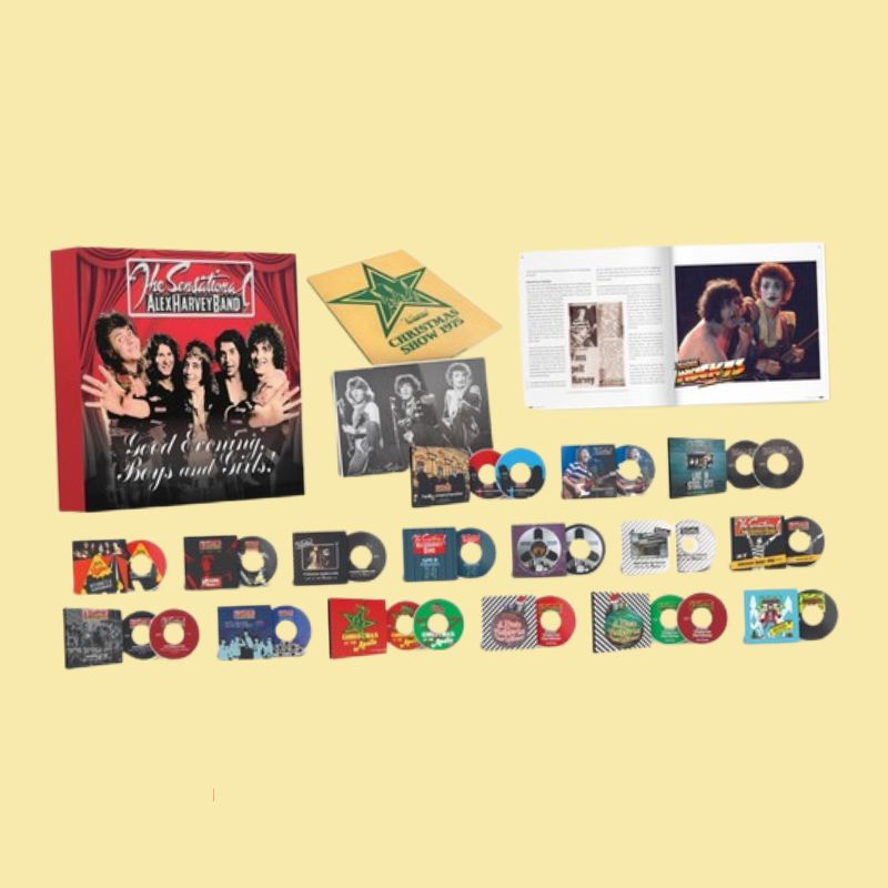 Specializzata in mastodontici box set a tiratura limitata zeppi di inediti, di rarità e di accessori, la Madfish si supera con questo cofanetto dedicato alla Sensational Alex Harvey Band, raccogliendo in 21 CD la bellezza di 16 concerti inediti che ci ricordano come proprio dal vivo il gruppo scozzese abbia saputo costruirsi negli anni '70 una reputazione leggendaria grazie a spettacoli vivaci, sempre diversi e pieni di sorprese. "Good Evening Boys & Girls" ne traccia l'evoluzione partendo da una esibizione del settembre 1973 al Marquee di Londra per poi documentare altri show tenuti tra il 1974 e il 1975 ancora a Londra, a Newcastle, a Syracuse (nello stato di New York), a Guildhall, a Manchester, a Sheffield, a Stoke-on-Trent, a Berlino e al Reading Festival, includendo nel programma anche una performance tenuta agli Electric Ladyland Studios di New York e il leggendario show natalizio del '75 all'Apollo di Glasgow a lungo favoleggiato dai fan e finalmente disponibile in forma ufficiale. Recuperato in gran parte dalle sorgenti originarie, soundboard e registrazioni radiofoniche, il materiale è stato rimasterizzato con cura da Pete Reynolds (Mott The Hoople, Fleetwood Mac, Wishbone Ash) al fine di restituire fedelmente l'atmosfera e l'eccitazione delle esibizioni; ricchissimo anche l'apparato iconografico, che oltre a un libro rilegato di 144 pagine con un saggio dello storico del gruppo Martin Kielty e foto rare e inedite, include riproduzioni di cimeli d'epoca provenienti da collezioni private, una replica del programma del Glasgow Apollo e una fotografia firmata dal chitarrista Zal Cleminson e dal bassista Chris Glen