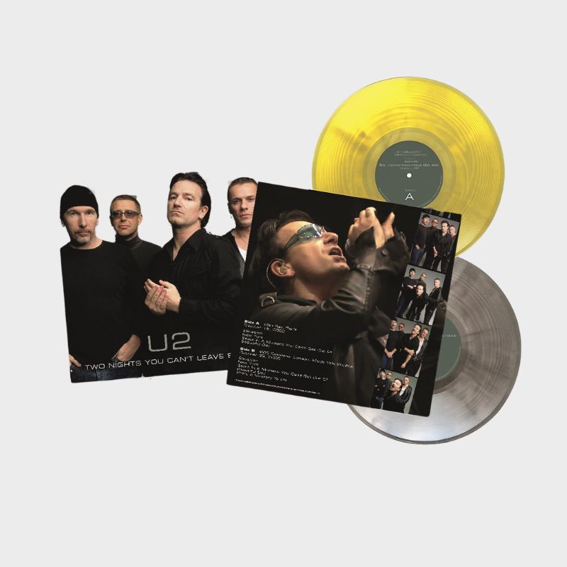 U2Two Nights You Can't Leave Behind: Paris & London 2000 - Numbered & ColoredSoundcraft stampa su vinile colorato a tiratura limitata e numerata (150 copie in colore cristallo/nero, 150 copie in colore giallo/nero) due registrazioni soundboard degli U2 riprese da eventi speciali organizzati in occasione del tour promozionale dell'album "All That You Can't Leave Behind". La pima facciata documenta la performance del 19 otttobre 2000 al bar Man Ray di Parigi, mentre la seconda contiene una BBC Session registrata il 23 ottobre dello stesso anno presso i Maida Vale Studios di Londra; entrambe le scalette comprendono quattro brani dal disco mentre la seconda si chiude con "She's A Mystery To Me" che fu scritta nel 1989 da Bono e The Edge per Roy Orbison track list